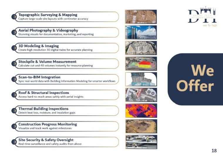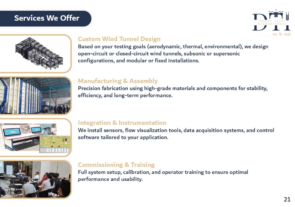 Drone Tech International (DTI) is a leader in advanced UAV solutions and specialized aerospace engineering services. In addition to delivering high-precision aerial surveying, inspection, and monitoring for industries such as energy, construction, agriculture, mining, and environmental management, we offer end-to-end wind tunnel design, engineering, and manufacturing. Our wind tunnel services are tailored for research institutions, universities, and industrial sectors, covering everything from conceptual design to fabrication and installation. DTI’s customized systems meet rigorous aerodynamic testing requirements, combining innovation, precision, and compliance with international standards.