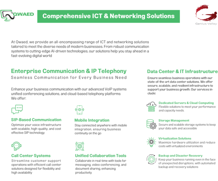 Qwaed Technologies is a trusted Huawei partner in Saudi Arabia, delivering world-class communication technology solutions. With Huawei’s global leadership in ICT infrastructure and smart devices, we bring cutting-edge connectivity to businesses and communities. Our expertise spans unified communications, IP telephony, data centers, IoT, and smart city technologies. We design and integrate secure, scalable, and future-ready networks to empower digital transformation. Together with Huawei, we connect people, organizations, and industries for a fully intelligent world.